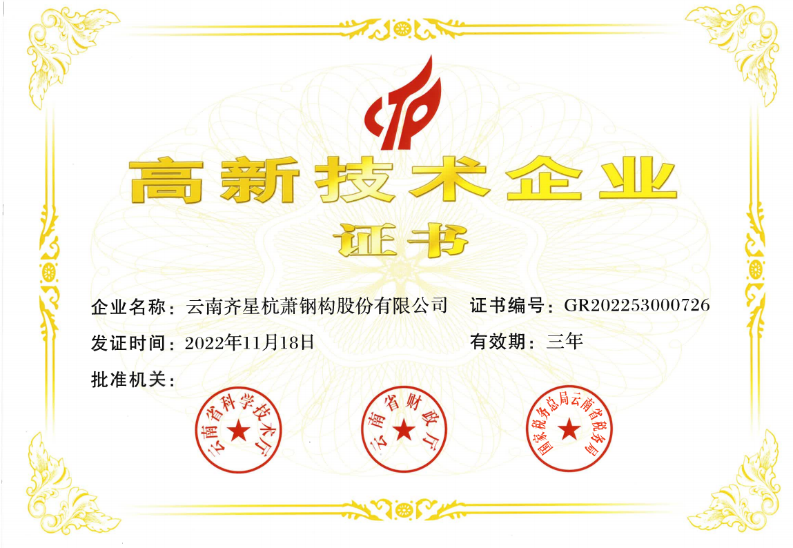 云南齊星杭蕭鋼構股份有限公司認真貫徹落實集團公司發展戰略,大力推進企業轉型升級,積極開展技術革新,取得了一批技術革新成果,2022年11月順利通過了“高新技術企業認證”;2019年5月,被云南省住房與城鄉建設廳評為“省級綠色裝配式建筑產業基地”;2020年12月被中華全國總工會授予“全國模范職工小家稱號”;2021年5月,作為承建“哈尼梯田全球重要農業文化遺產保護傳承學校”援建項目的“項目攻堅優秀合作團隊”,收到了中共中國五洲工程設計集團的感謝信。