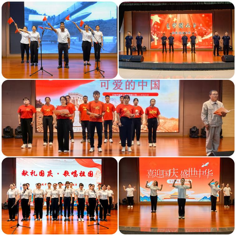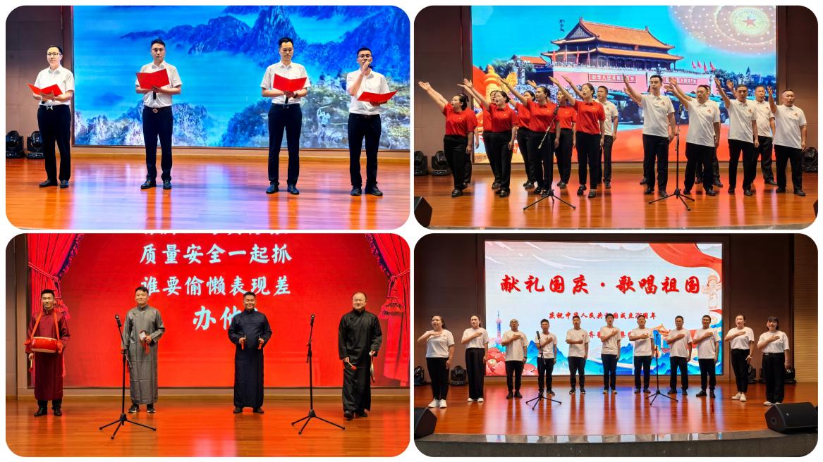 活動現場,各片區、分(子)公司、集團行政各部門的產業工人代表們以飽滿的熱情、嘹亮的歌聲、精彩的演繹、深情的朗誦表達了對祖國的無限熱愛和祝福。節目精彩紛呈,輪番上演,有合唱曲目《歌唱祖國》《我們走在大路上》《中國人》《我的中國心》《走向復興》深情豪邁、慷慨激昂,情景劇《可愛的中國》讓人熱淚盈眶,詩朗誦《獻禮國慶》讓人熱血沸騰,《三句半·國慶喜樂匯》讓人撫掌開懷,手指舞《明天會更好》創意滿滿,精彩的節目不斷激起臺下觀眾的共鳴,更贏得陣陣掌聲。活動的最后,全體觀眾和演員共同合唱了《我和我的祖國》及《歌唱祖國》兩首經典曲目,歌聲響徹整個會場,將活動推向了高潮。在這一刻,每個人的心中都充滿了驕傲和自豪,更充滿了對祖國的熱愛和敬仰,也更加堅定了為實現中華民族偉大復興的中國夢而努力奮斗的信念和決心。